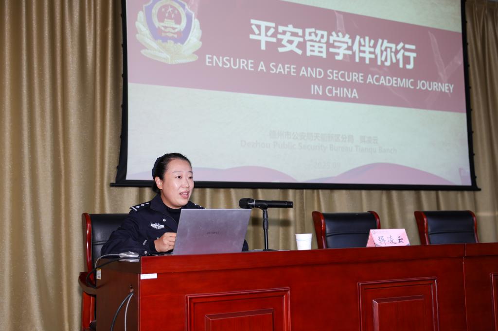 随后的安全教育环节实用且贴心。德州市公安局天衢新区分局出入境管理科及新城派出所的民警结合留学生在华生活常见场景,围绕校园安全、交通安全、消防安全、网络安全及应急求助方式等内容展开讲解,细致的提醒与实用的技巧,让留学生们全面了解在华生活的安全注意事项。
