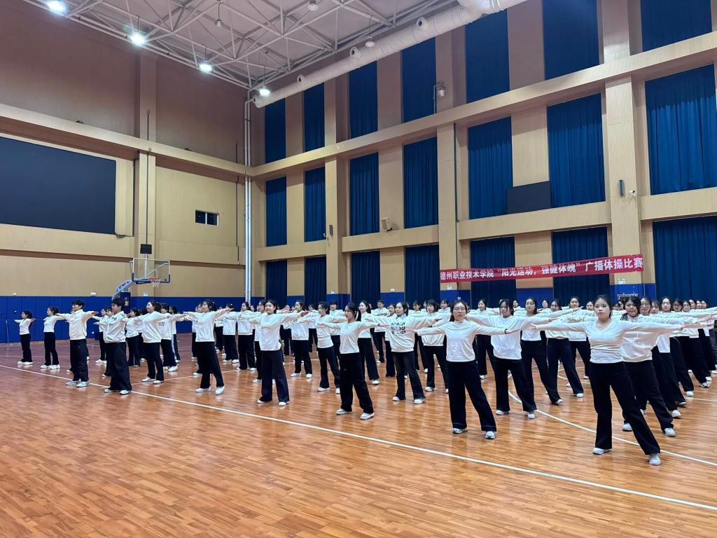 学前教育与社会服务系在指定区域集合后,有序列队进入综合训练馆。同学们步伐铿锵、精神抖擞,以饱满的状态迅速进入比赛站位。伴随广播体操音乐响起,他们的动作整齐划一:伸展、扩胸、踢腿、弯腰,每一个节拍都精准契合,舒展的姿态尽显青春活力,嘹亮的口号更是点燃了现场氛围。评委团围绕动作规范性、队列整齐度、精神风貌等维度进行细致评分,现场不时响起阵阵掌声,为各队伍的精彩表现喝彩。