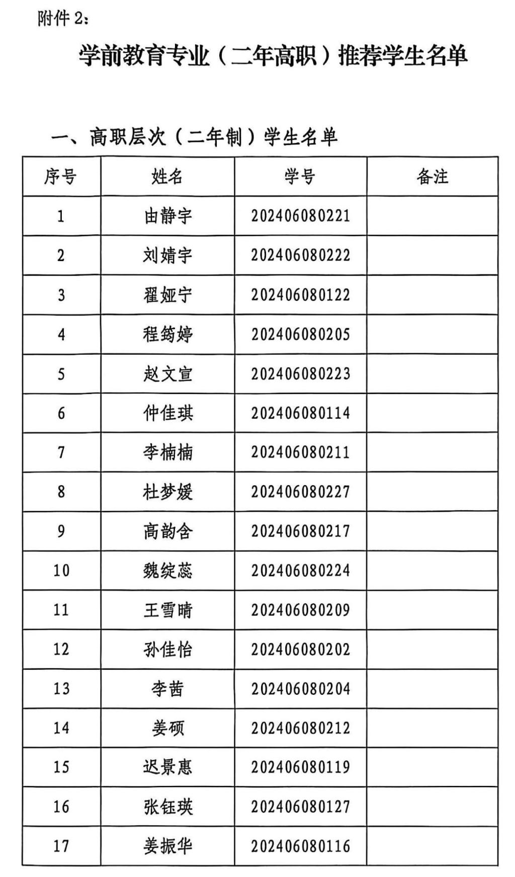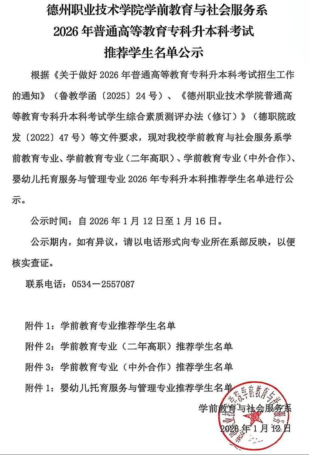 德州职业技术学院学前教育与社会服务系2026年普通高等教育专科升本科考试推荐学生名单公示