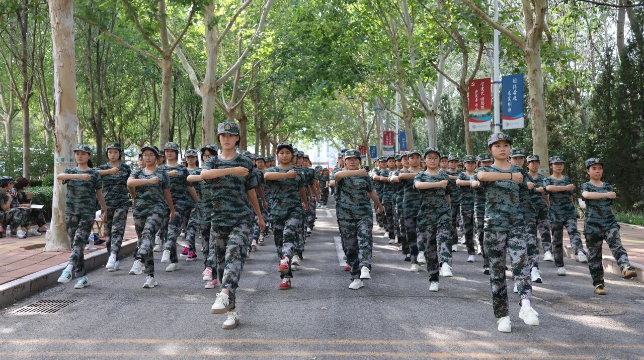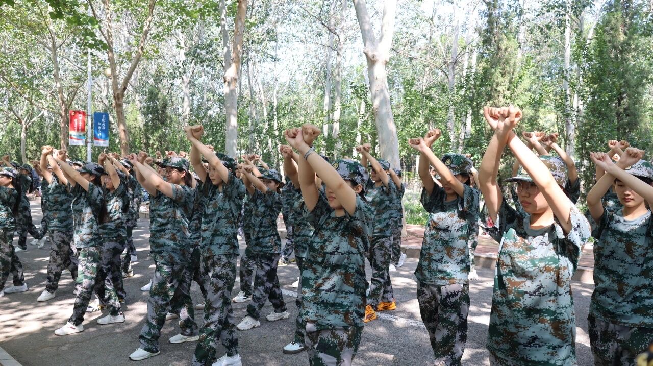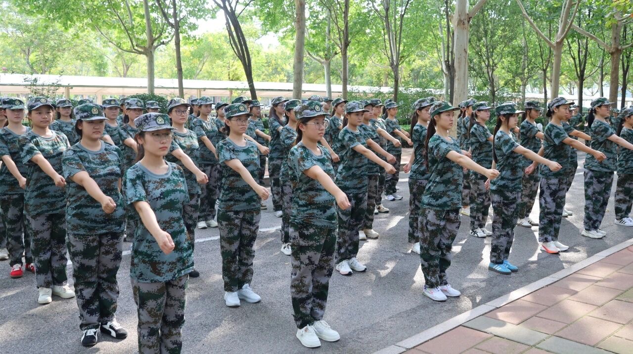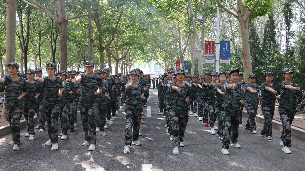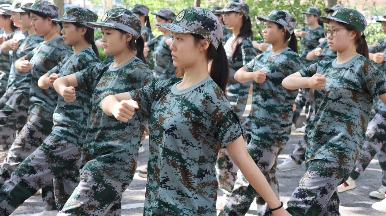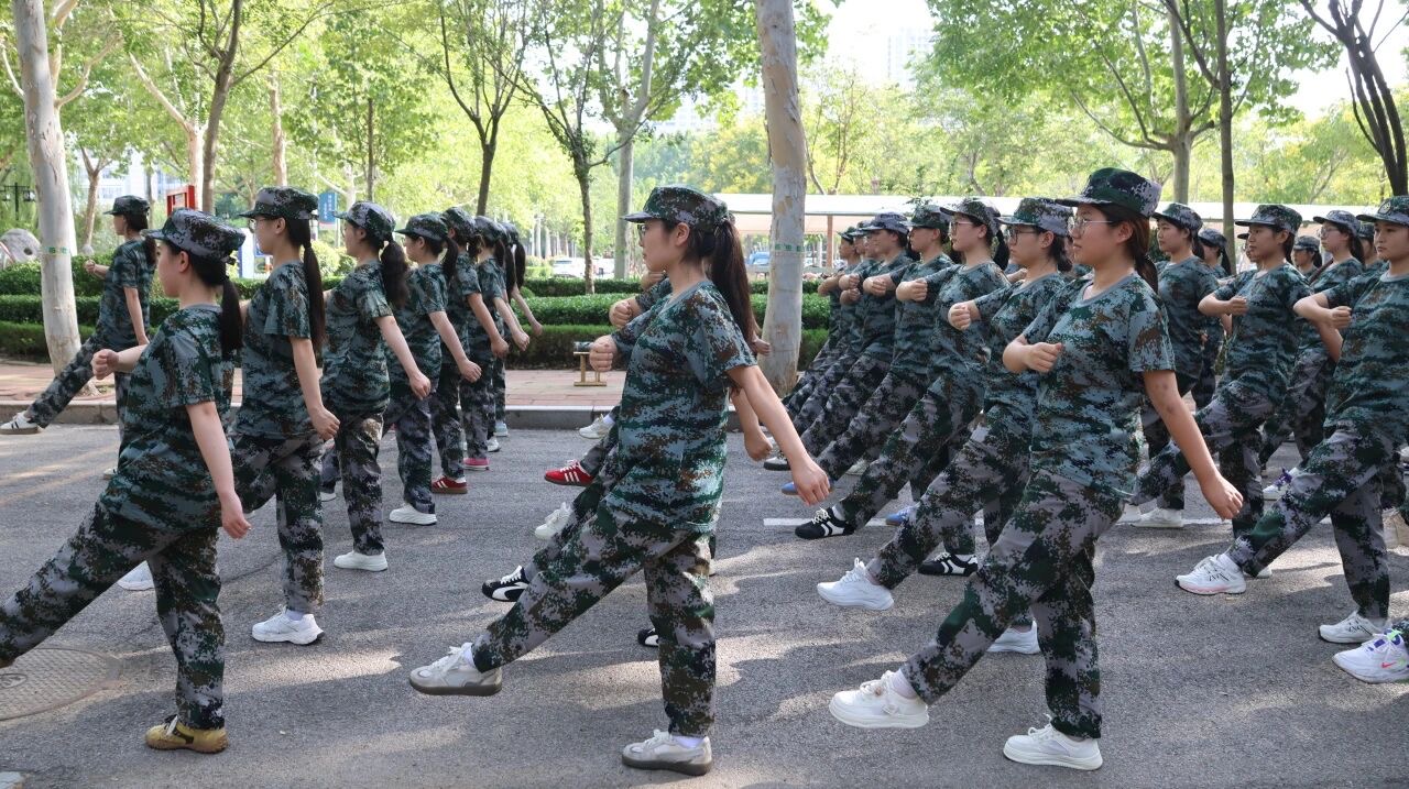 训练场上,教官一声令下,“齐步走!”同学们迈着整齐的步伐,手臂有力地前后摆动,每一步都踏得坚定且富有节奏,如同精密仪器般协调一致。紧接着,“正步走!”指令响起,大家迅速变换步伐,腿部绷直,脚尖下压,以沉稳的节奏向前踢出,落地时发出整齐划一的声响,彰显出蓬勃的朝气与严谨的态度。随后,军体拳训练开始,“弓步冲拳”“穿喉弹踢”,同学们动作刚劲有力、干脆利落,出拳带风,踢腿生威,每一个招式都凝聚着力量与决心,将青春的热血与激情融入到每一次出拳、每一次踢腿之中。训练中,汗水浸湿了同学们的衣衫,但他们眼神中的坚毅从未动摇,始终以饱满的精神状态投入其中。