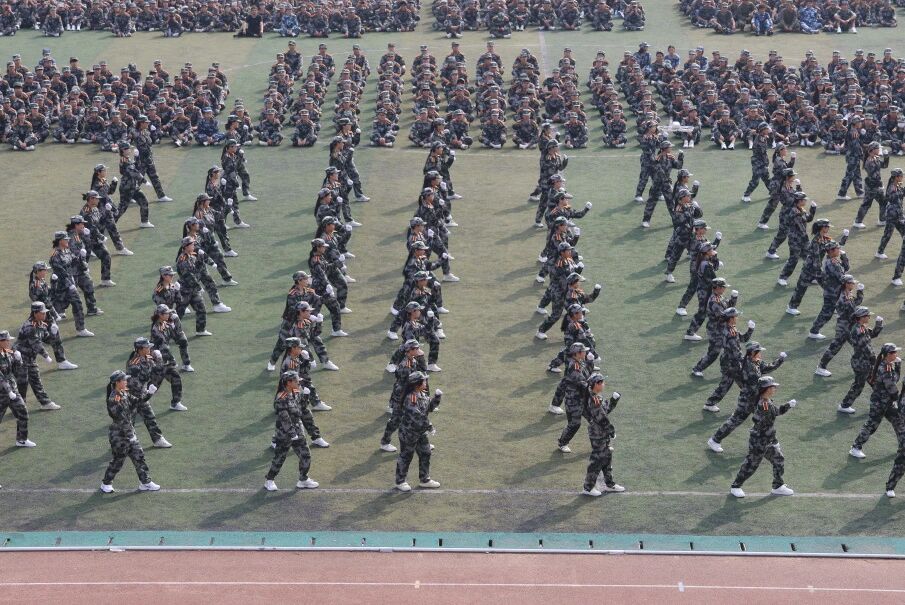 汇演当日,操场上迷彩涌动,学前教育与社会服务系的方阵,在辅导员助理的引领下,踏着整齐有力的步伐进入会场。新生们身着同款迷彩服,个个精神抖擞、气宇轩昂,不仅队列动作整齐划一,每一次转身、每一回摆臂都精准一致,还精彩呈现了军体拳表演,一招一式刚劲有力、虎虎生风,充分展现出军训所培养的纪律意识与团队凝聚力。